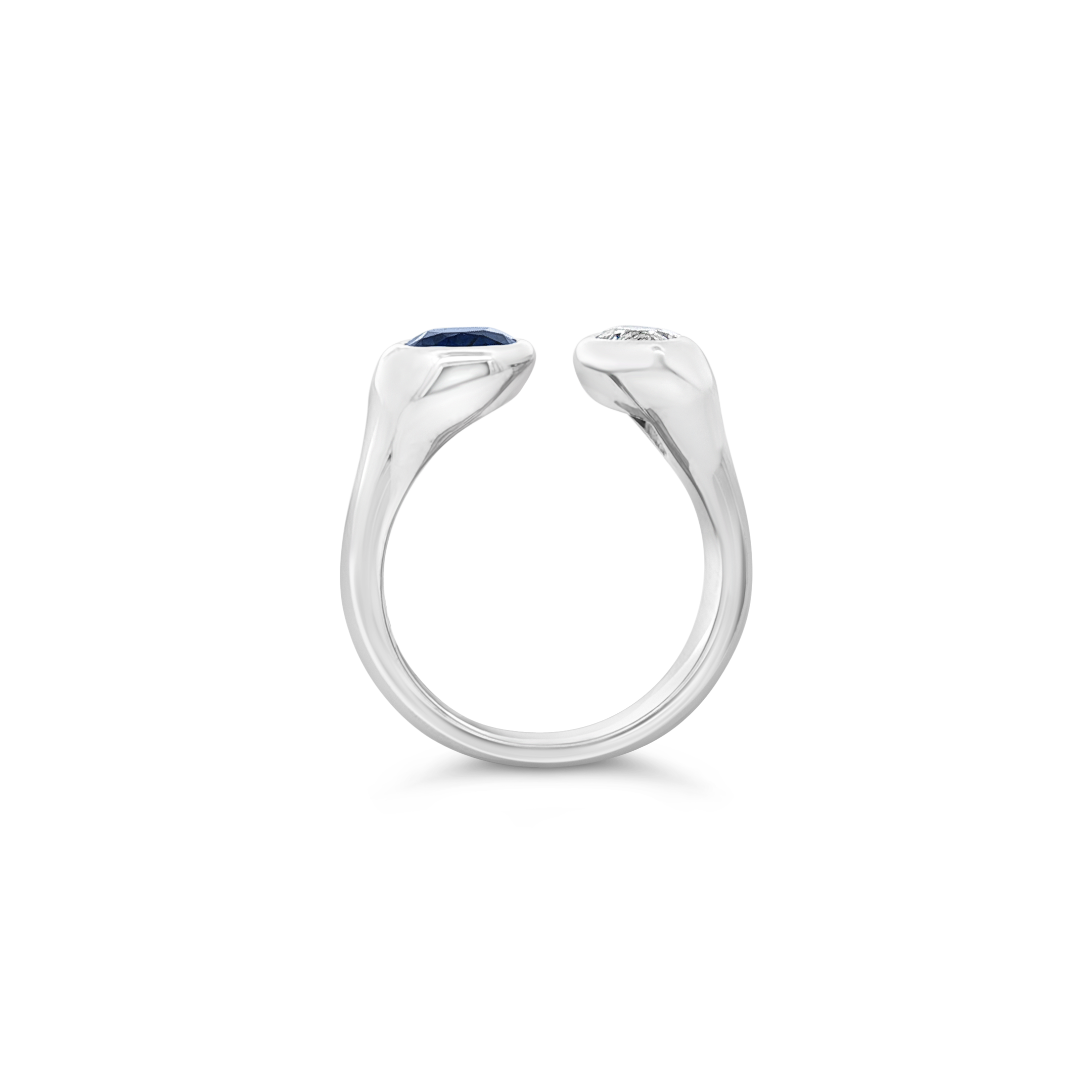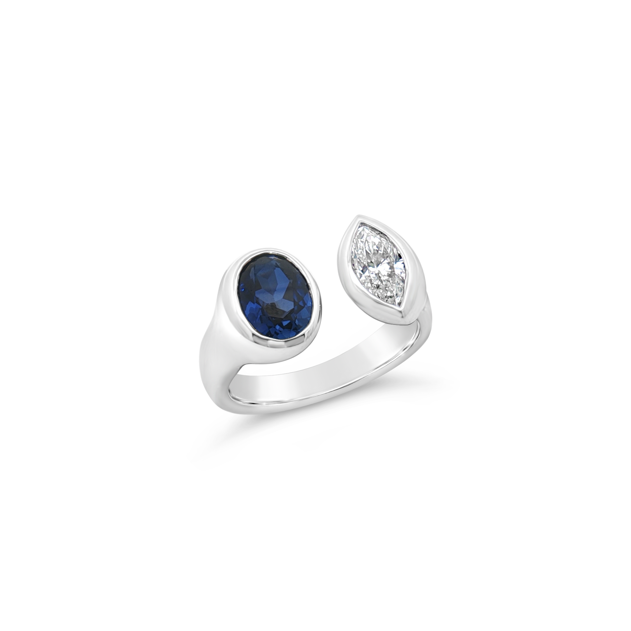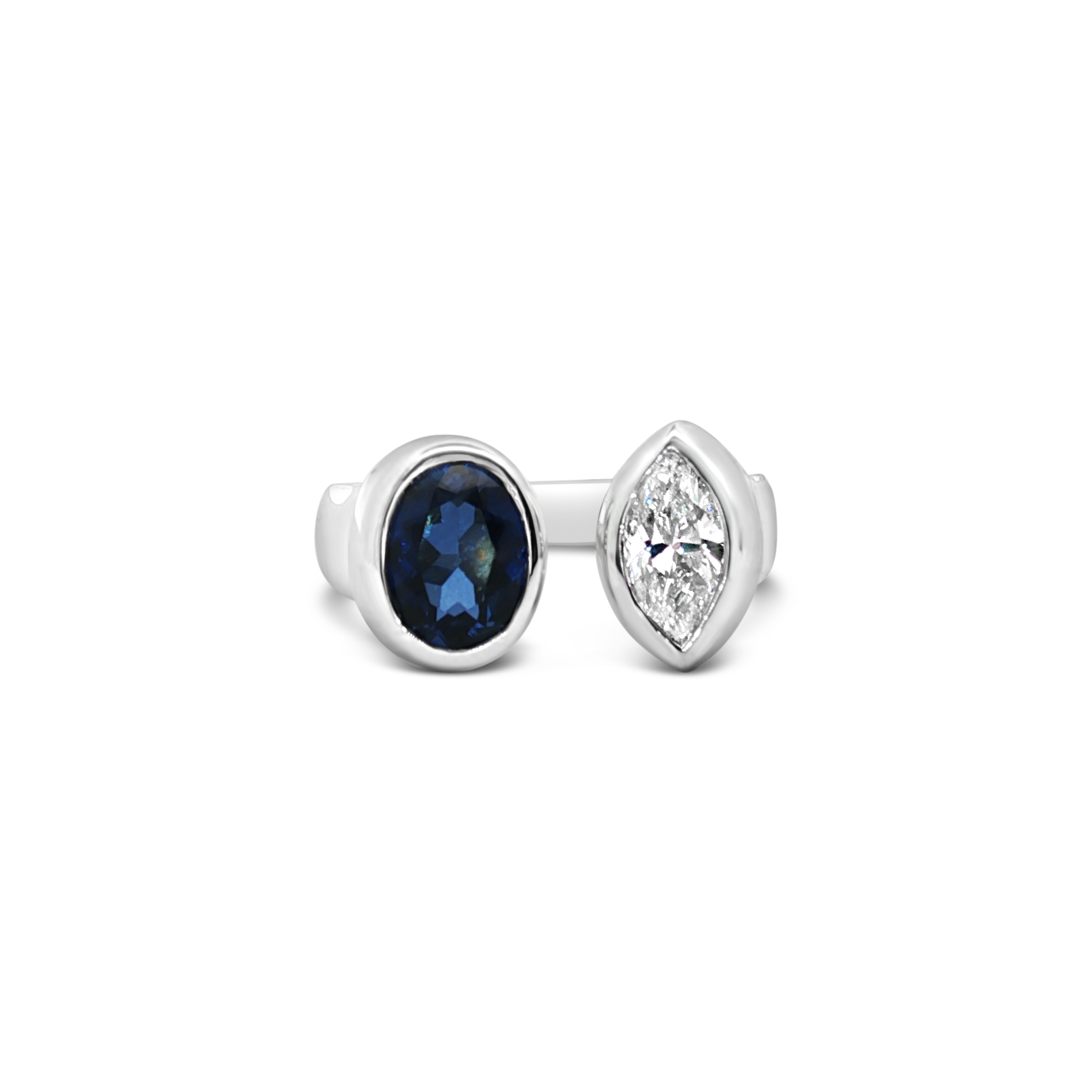 Oval blue sapphire and marquise diamond set in 14k white gold in this Moi Et Toi style ring. Weight of the sapphire is 1.39 carats. Diamond weight is .70 carat.