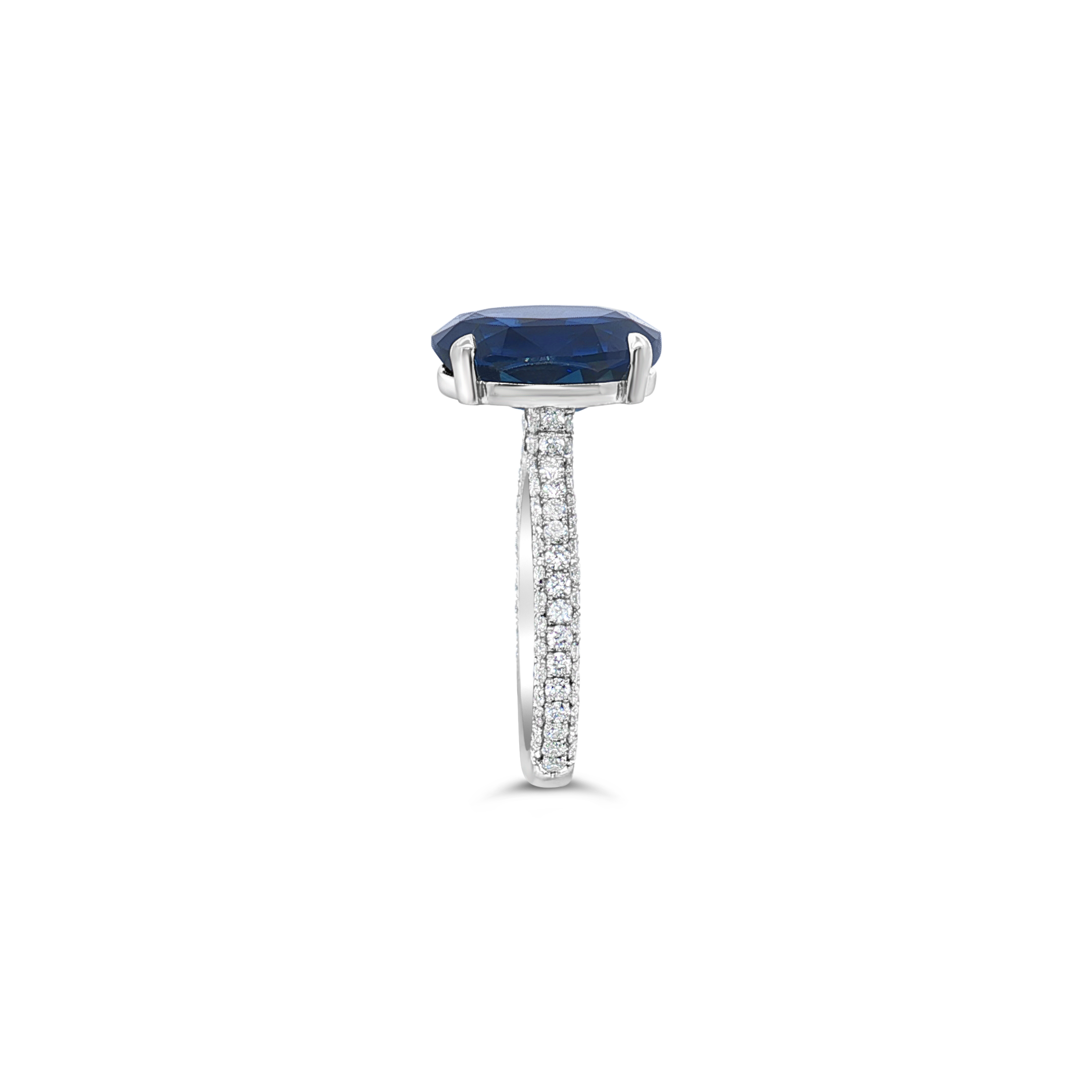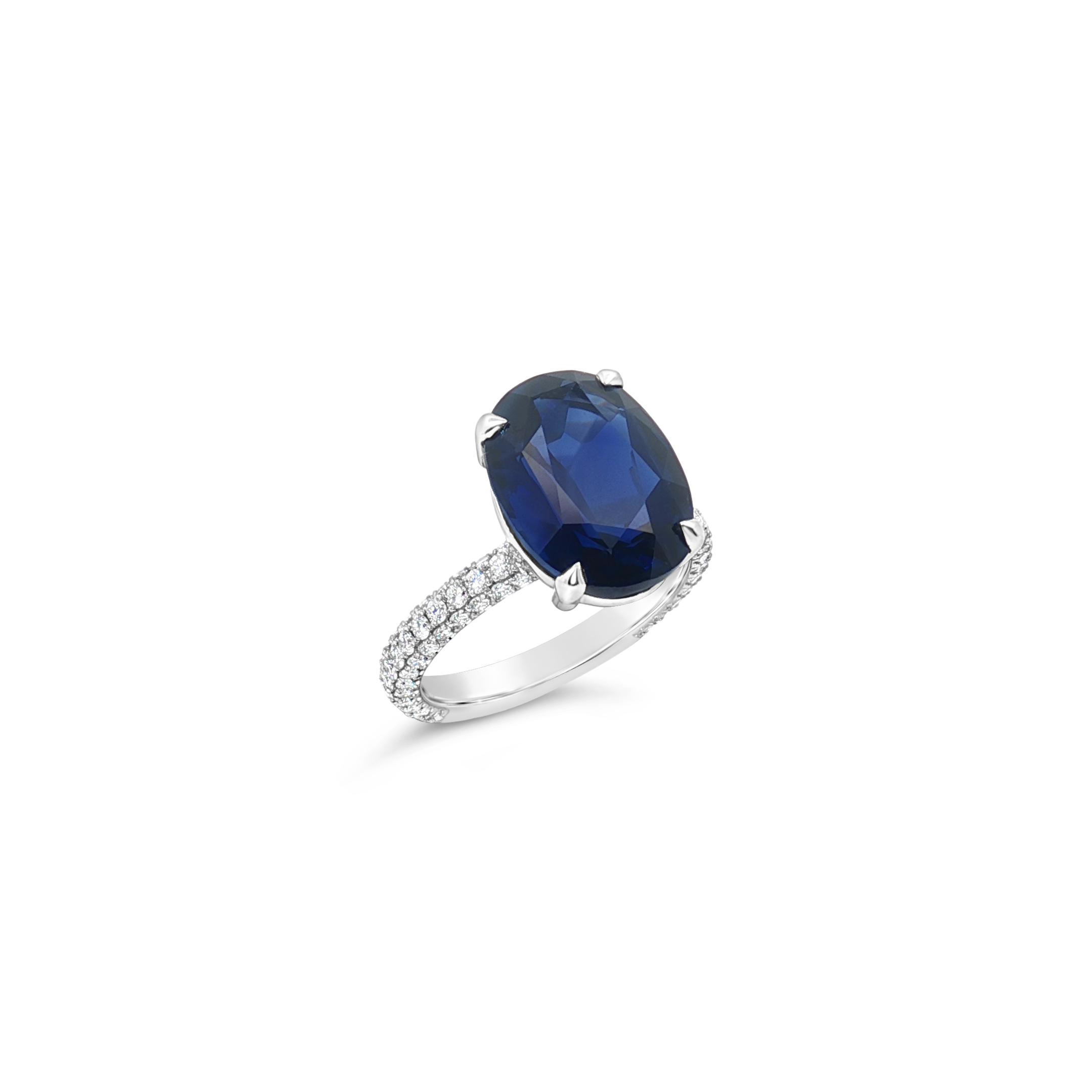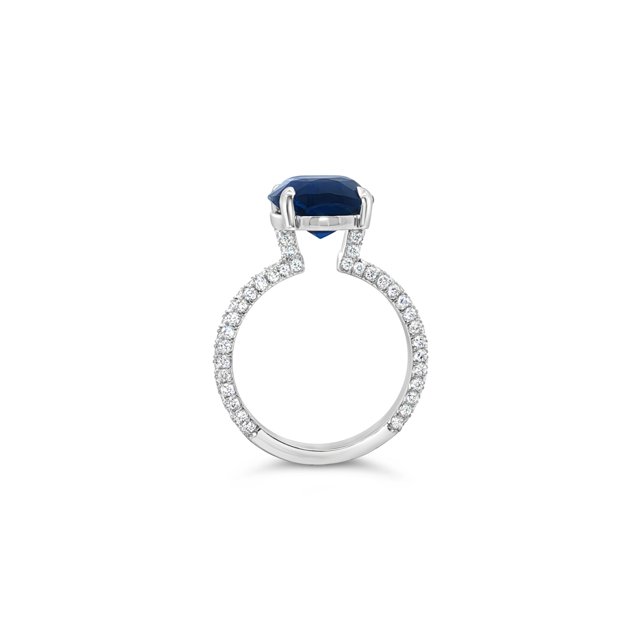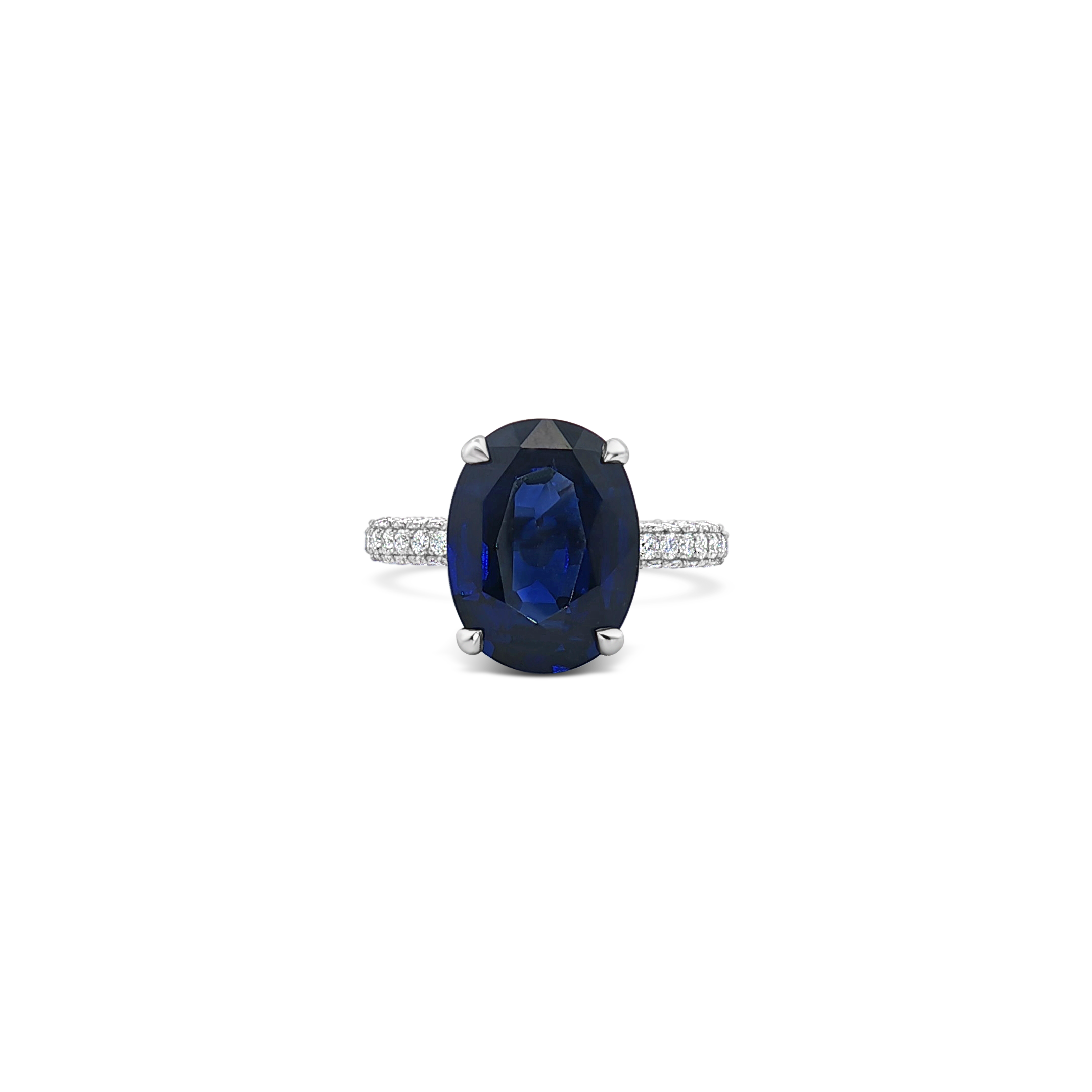 Oval blue sapphire with round diamonds in the shank of this platinum ring. Sapphire weighs 6.05 carats. Total diamond weight is 1.20 carats.
