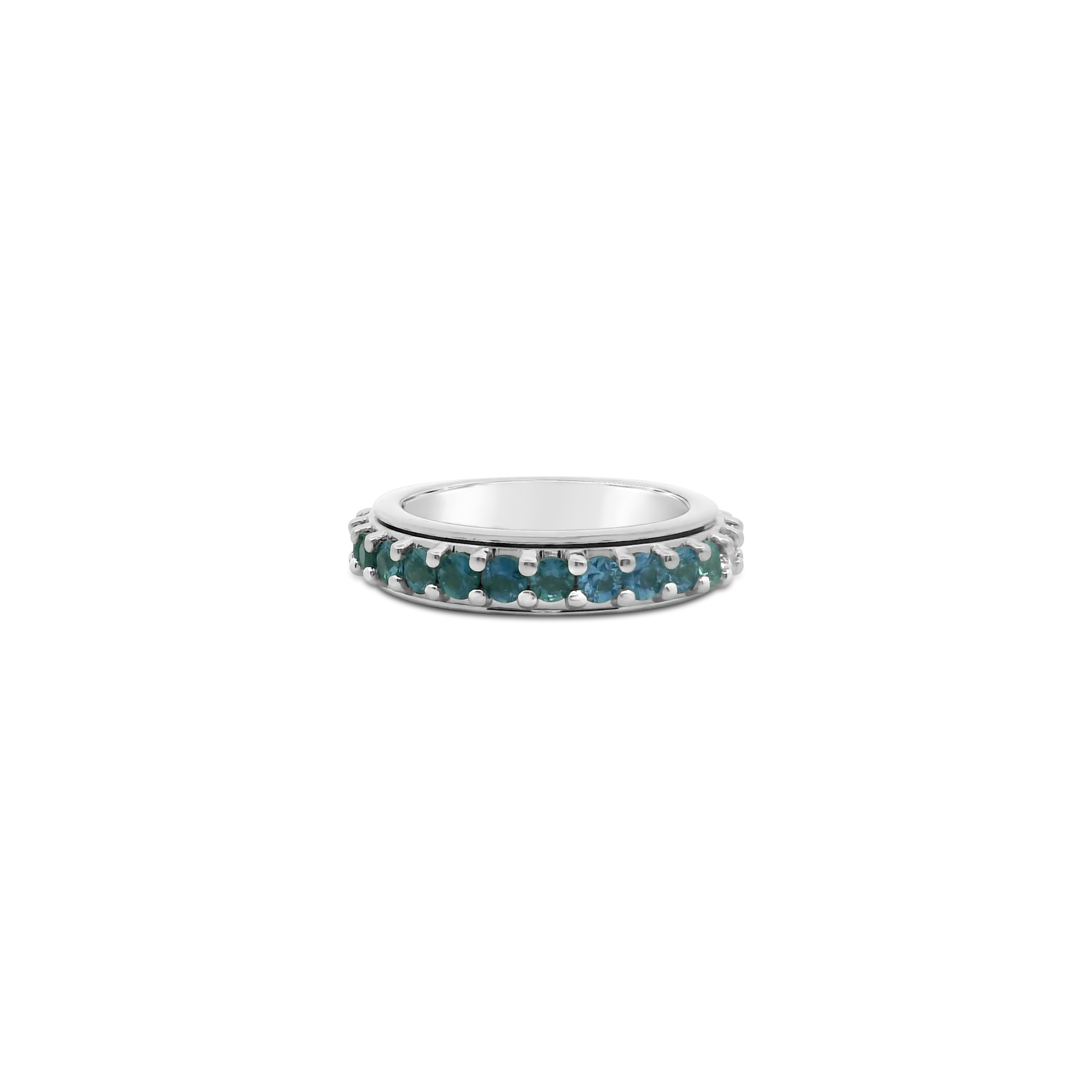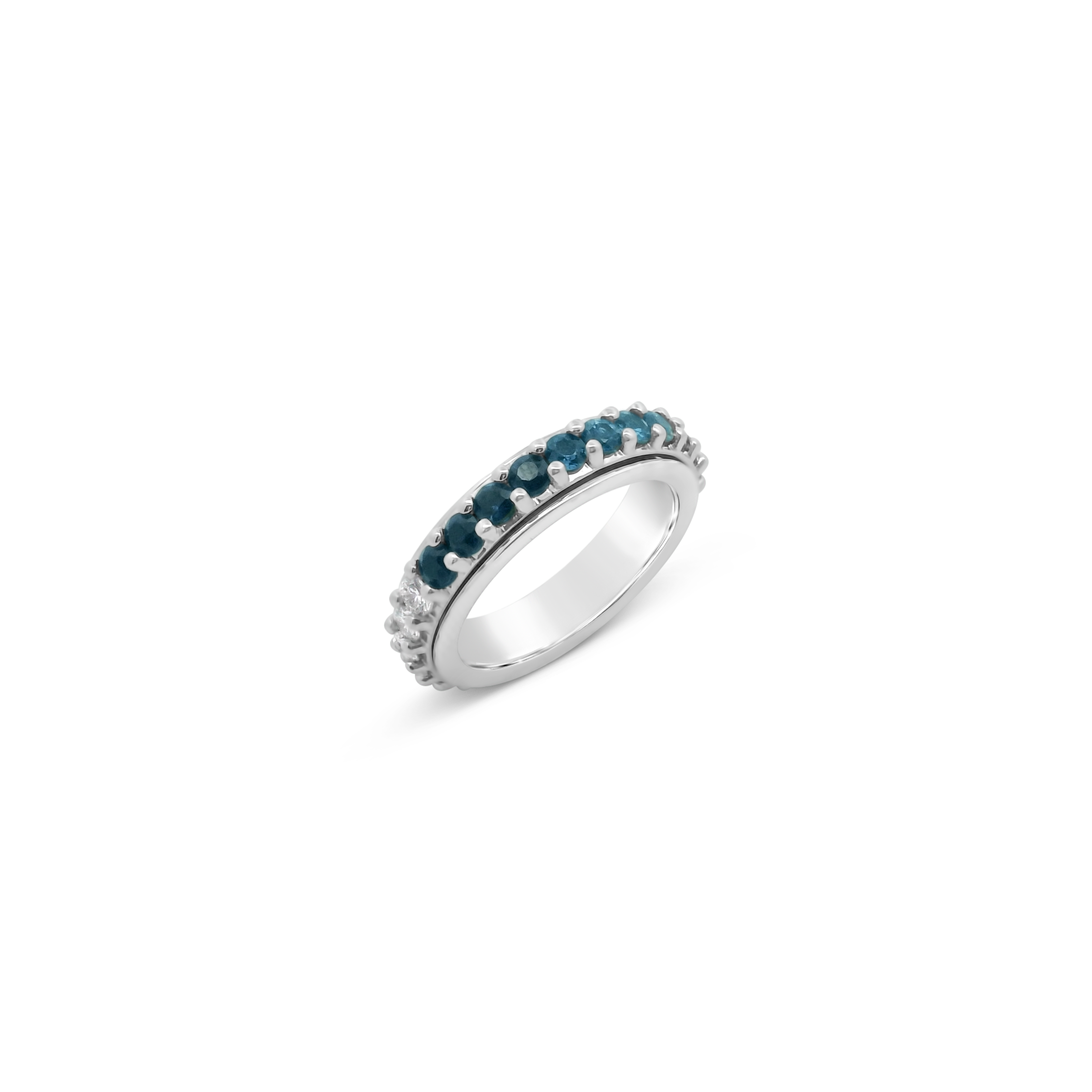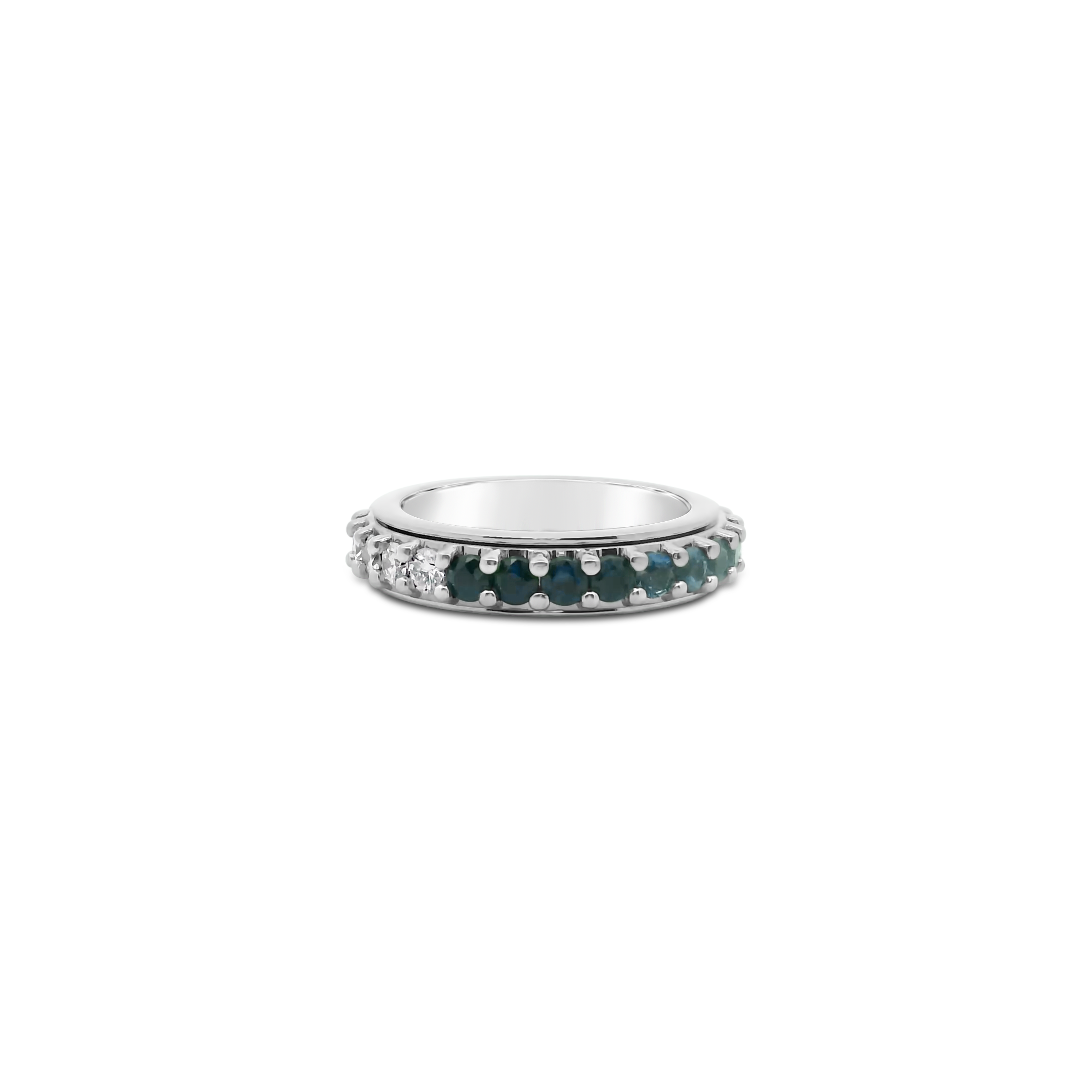 Round blue sapphires and round diamonds set in 18k white gold in this spinner style ring. Total weight of the sapphires is 1.81 carats. Total diamond weight is 1.11 carats.
