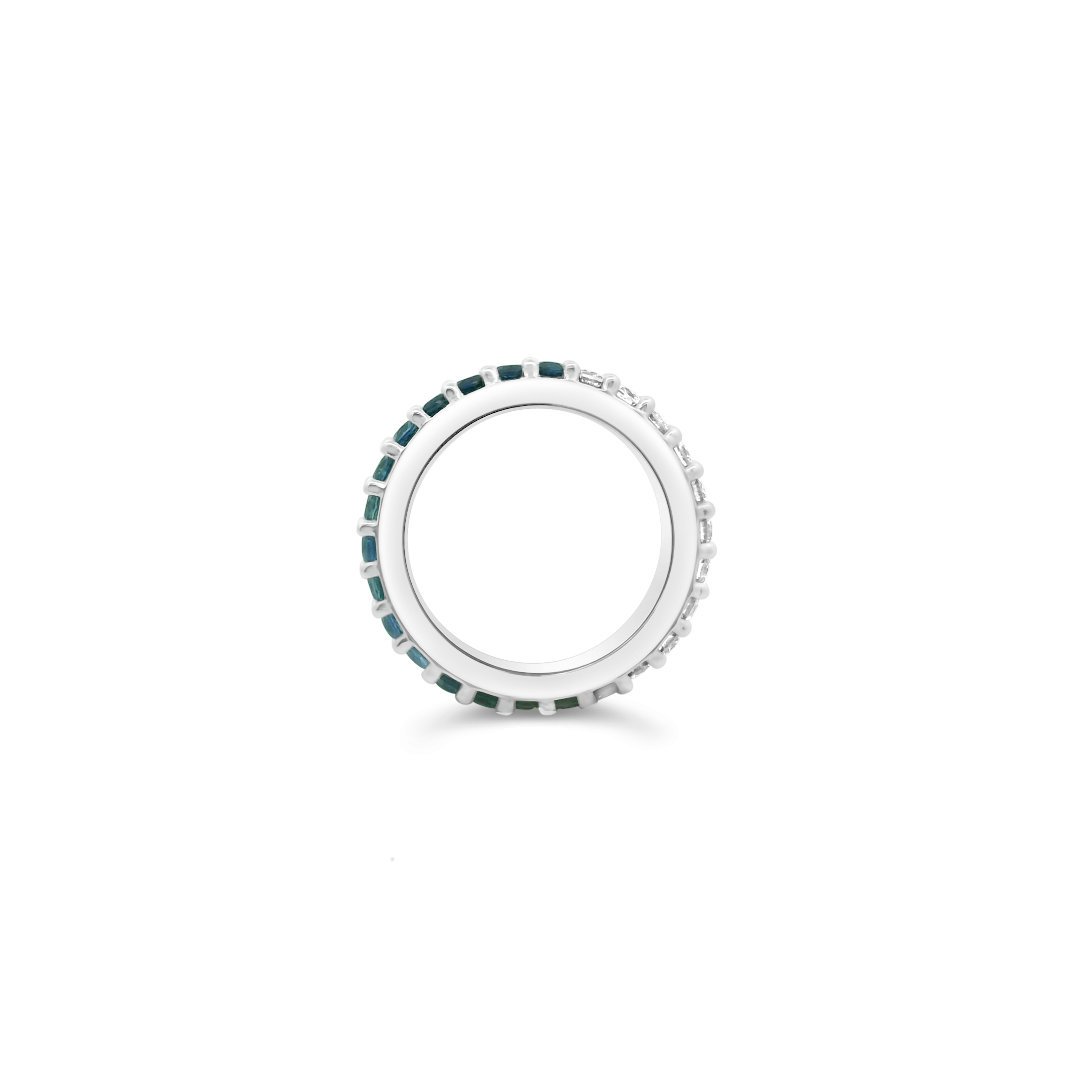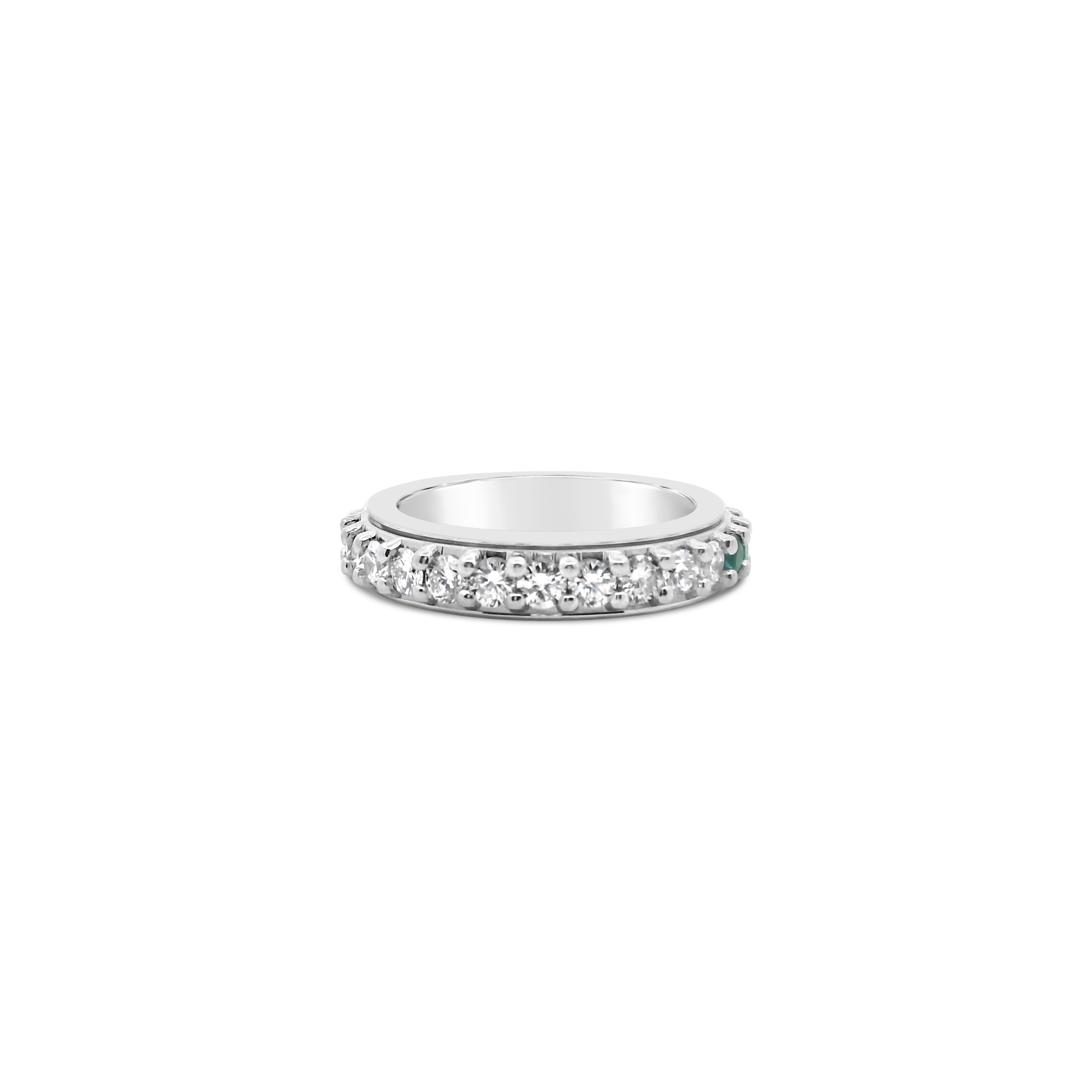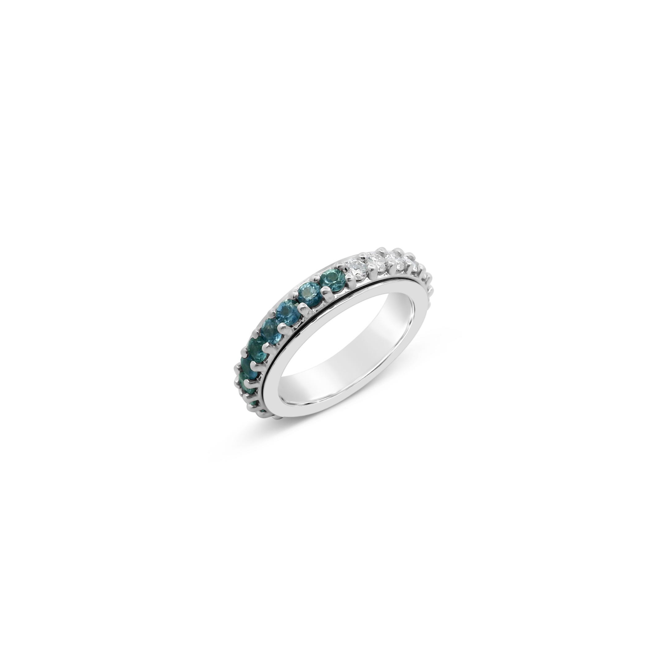 Round blue sapphires and round diamonds set in 18k white gold in this spinner style ring. Total weight of the sapphires is 1.81 carats. Total diamond weight is 1.11 carats.