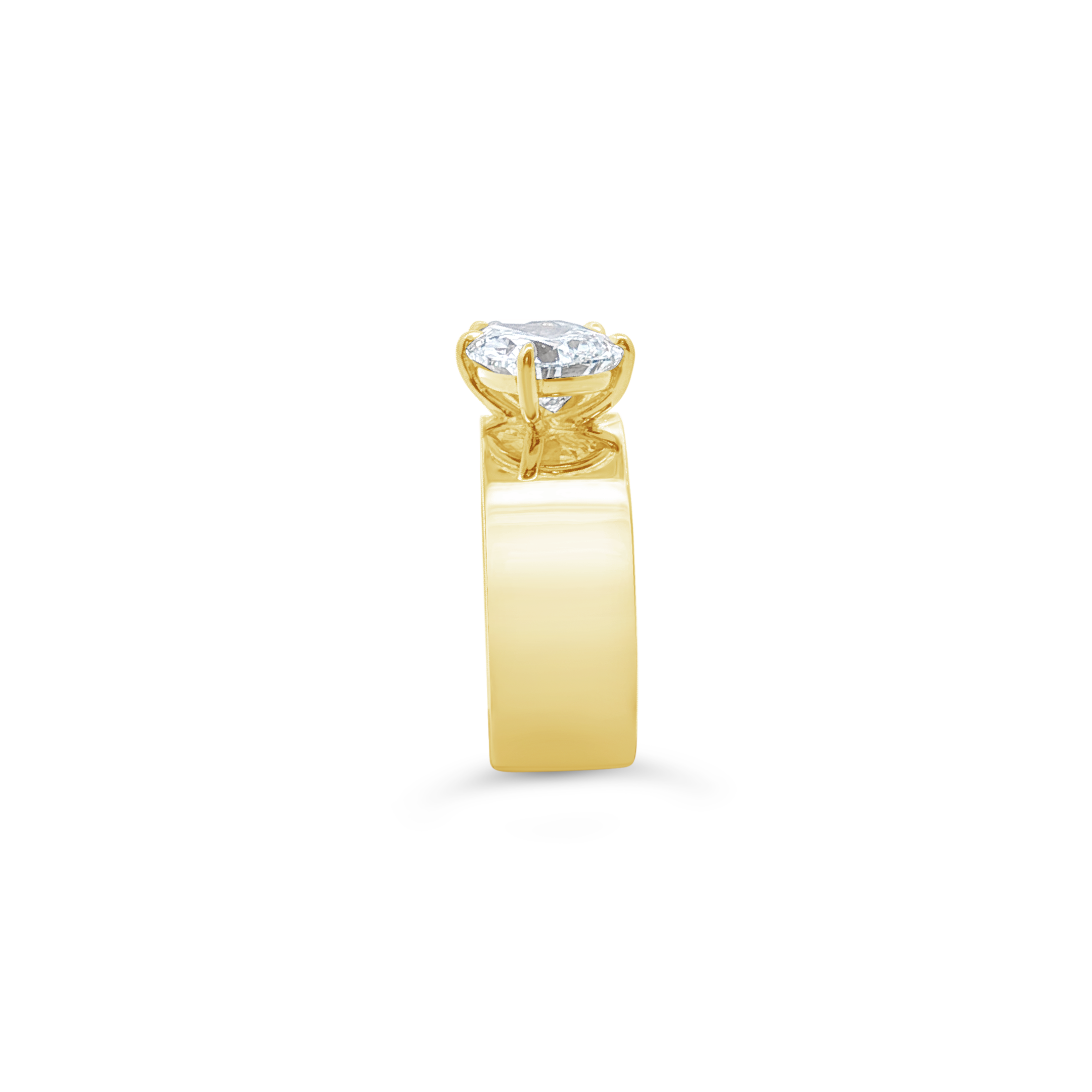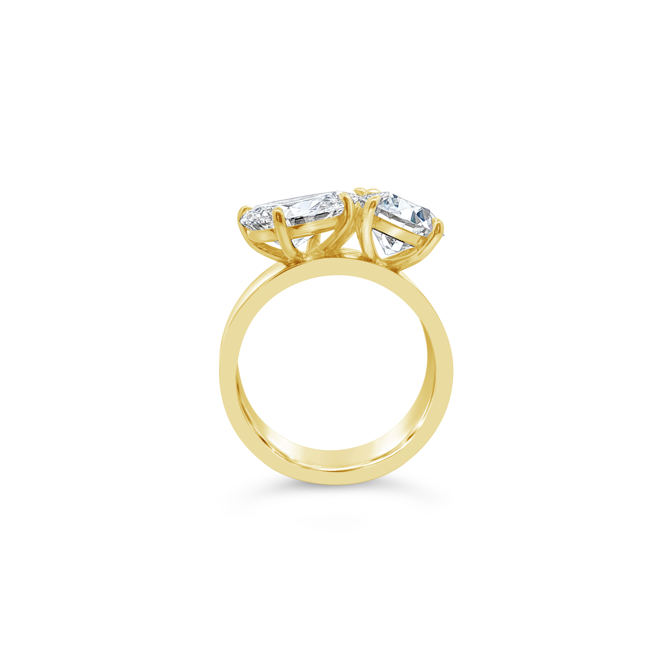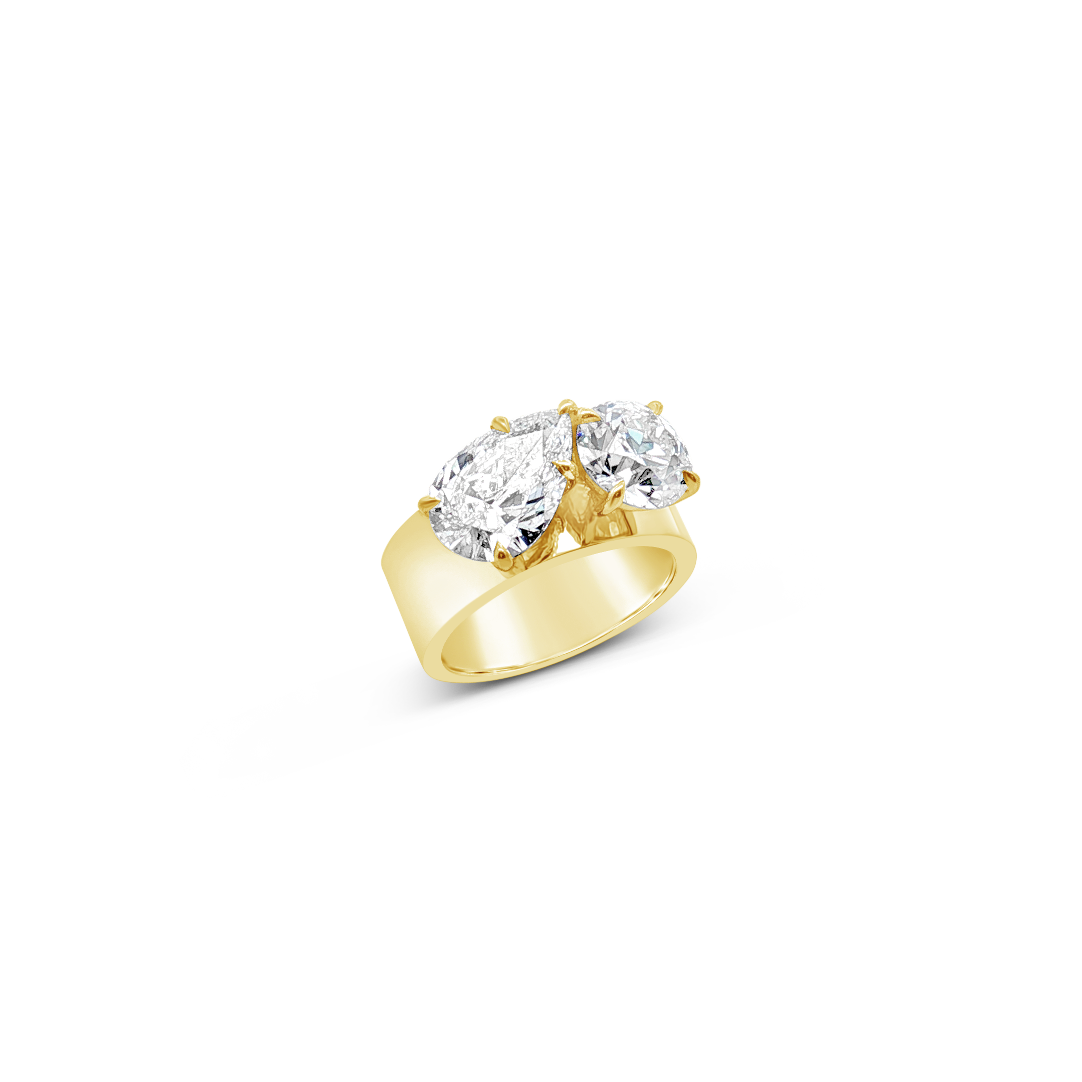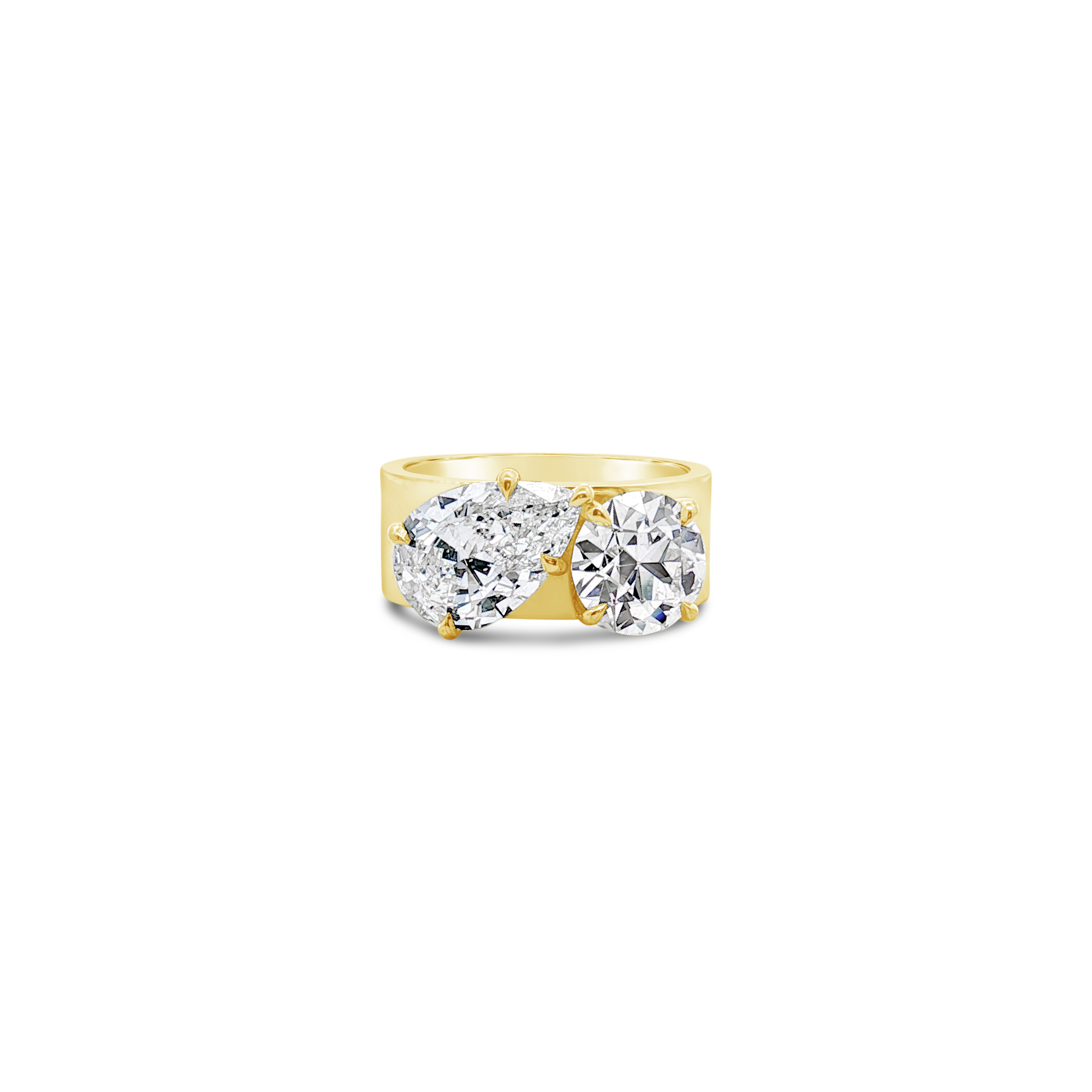 Pear shaped and round diamonds set in this 18k yellow gold band style ring. Total weight of the two diamonds is 7.26 carats.