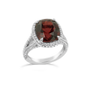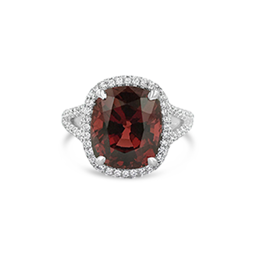 Cushion cut red spinel with round diamonds set in platinum in this split shank ring. Weight of the spinel is 5.56 carats. Total weight of the diamonds is .85 carat.